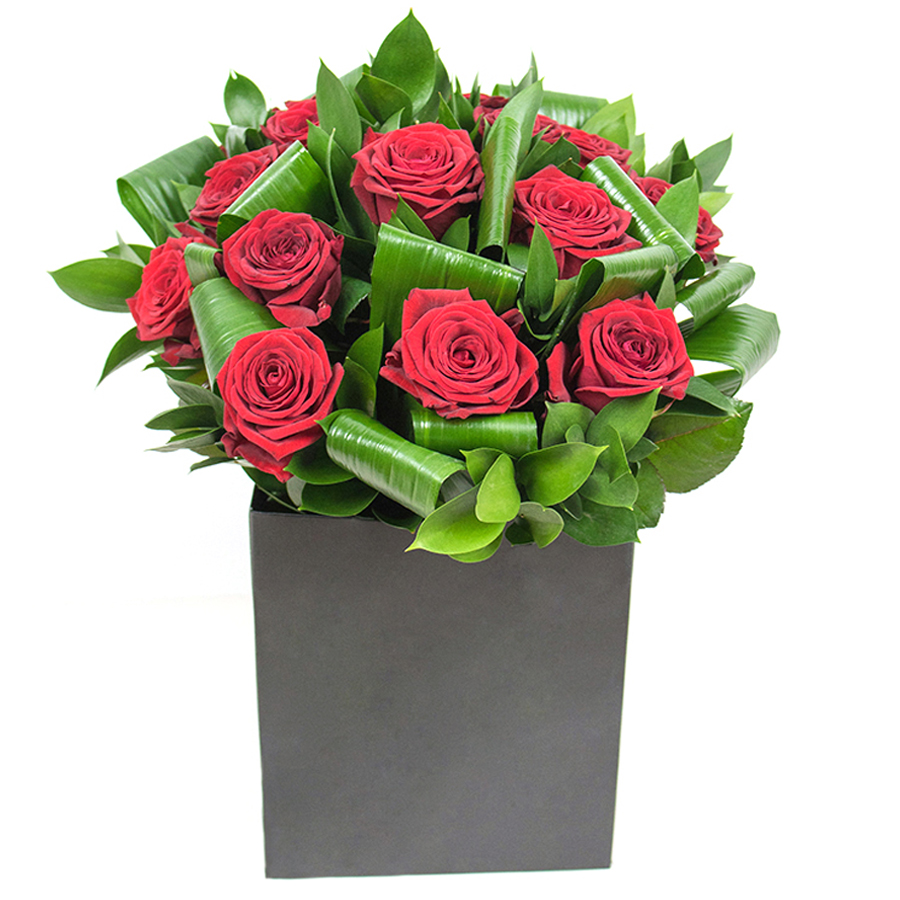 Delight in the gorgeousness of our red rose floral arrangement, featuring stunning red roses, vibrant aspidistra leaves, and elegant ruscus. This unique bouquet is crafted to deliver unmatched beauty and elegance, ideal for a luxurious gift.