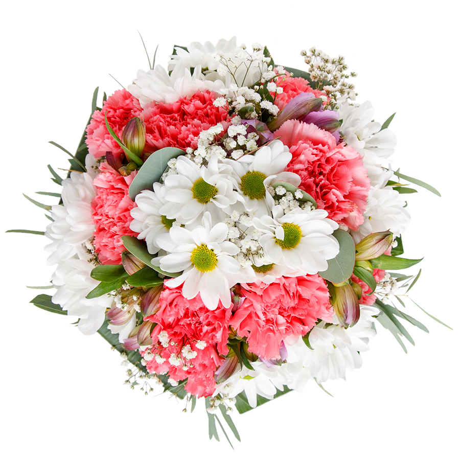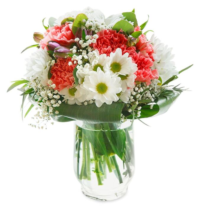 Discover the graceful elegance of our Floral Arrangement, a beautiful mix of white chrysanthemums, gypsophila, light pink carnations, and aspidistra leaves, designed to captivate and charm.